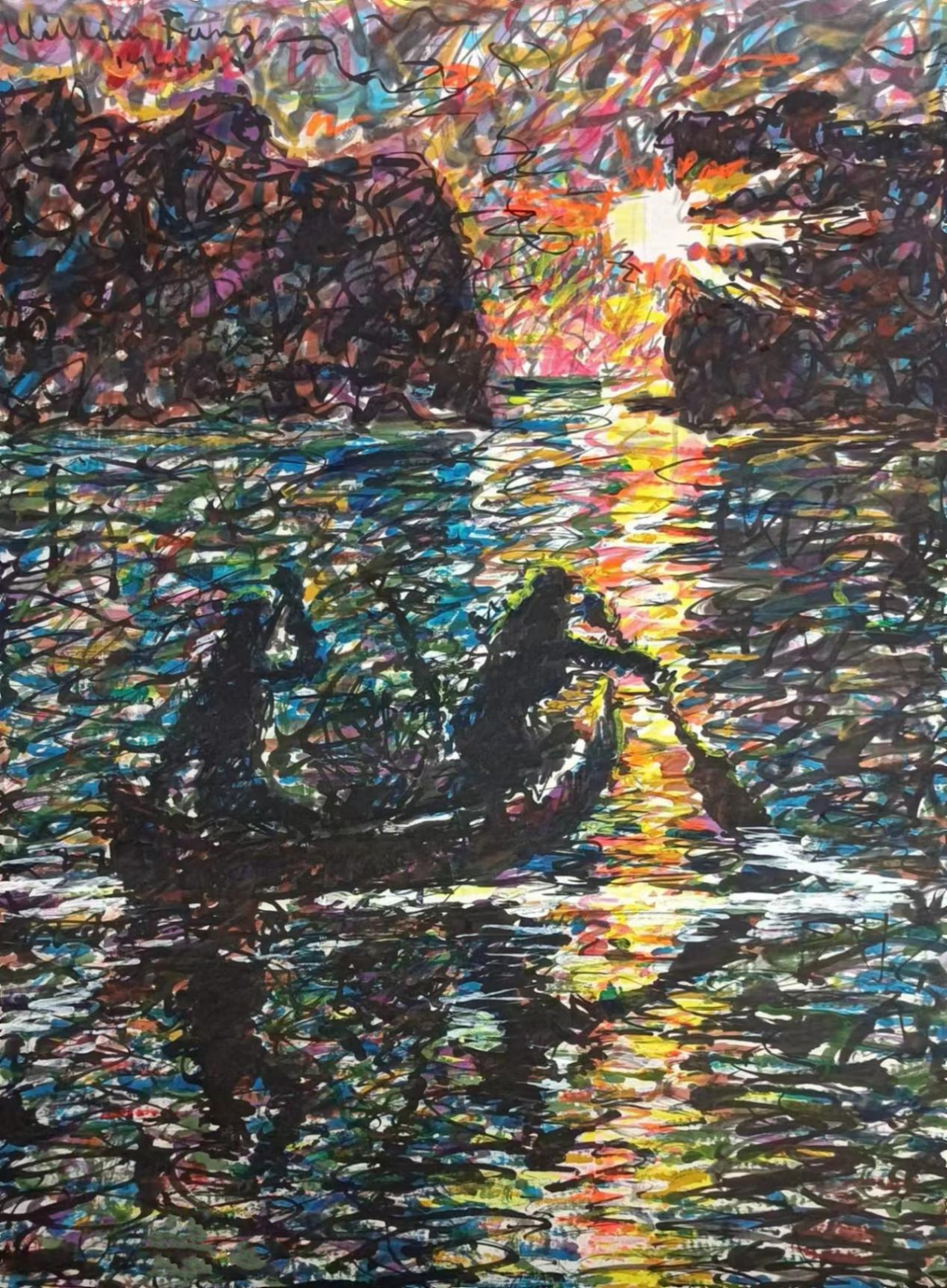 于是,他秉持着“无新不出画”的信念,受法国印象主义修拉“点彩派”的启发,在深厚的中国传统绘画的基础上,他创造了“乱线画”。“乱线画”是以中国画的灵魂线条为核心,随意涂写,利用彩色线条的纵横交错表现来营造形象。近看抽象,远看具象。从混沌中获取了似与不似的形象,以东方的线条寻求西方绘画的效果。