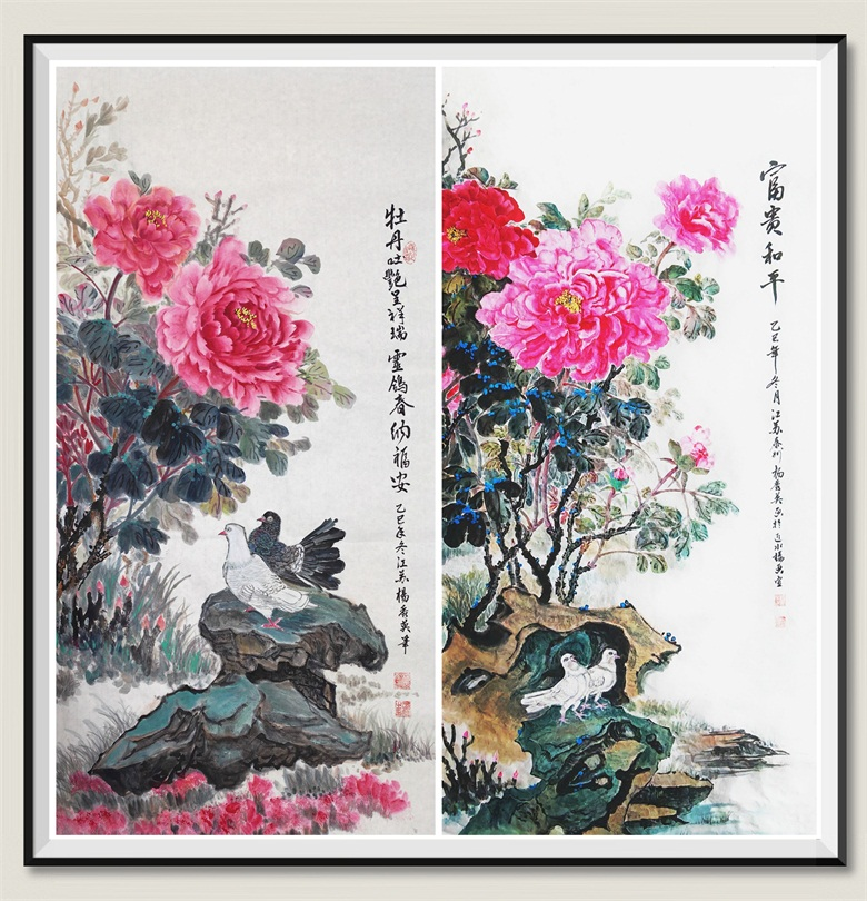左:《鸽迎牡丹春》