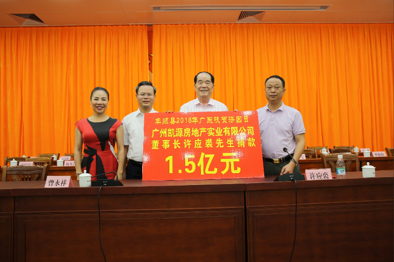 6月27日,广东丰顺县2018年广东扶贫济困日活动启动仪式在县会展中心隆重举行。表彰2017年丰顺扶贫济困日活动先进单位和个人,动员部署今年扶贫济困日活动。至目前,该活动共筹得善款(含认捐) 4亿多元。活动当天现场认捐1.85亿元。其中,广州凯源房地产实业有限公司许应裘先生捐款1.5亿元,广东珠光集团捐款2000万元,广东省陈绍常慈善基金会捐款1500万元。会前,留隍杰出乡贤朱孟依先生已认捐2.18亿元;其中1.18亿元用于我县扶贫项目资金,1亿元用于我县乡村振兴资金。