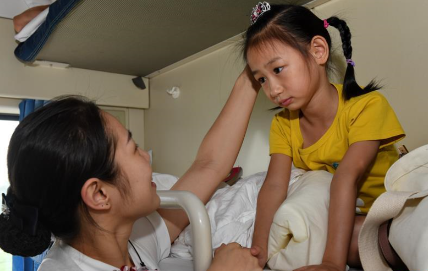 7月8日,在福州开往北京西的Z60次列车上,乘务员在照顾一位父母在北京工作的小朋友。