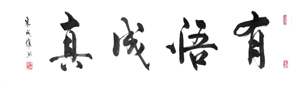 书法和绘画一样要有诗的意境,有时候用焦墨、有的时候要用枯墨、有的时候用淡墨,甚至包括涩墨,墨的五色变化要体现的淋漓尽致,作品才有韵味,才能生动活泼。朱成维认为:书法,贵在沉静,沉出气势、静生神韵,只有沉静的时候才能显现出来书法的奥妙,所以心浮气躁写字则难以入手,写出的书法必定即火又燥。心态平和,先净化思维,随着笔,随着眼,随着泼豪的过程,画横,画到二三十分钟以后,才能进行创作。调整心态、调整呼吸,然后,可直接做到自然起,自然停,画多长为标准,以六厘米和5.5厘米的长度,宽度是0.2厘米,其心法,第一步,先能听到自己的喘气声,第二步,稍微能听到自己的心跳声,进一步静了,能听到纸和笔的摩擦声音,等再进一步,能闻到墨的特殊香味儿,就墨香味儿。
