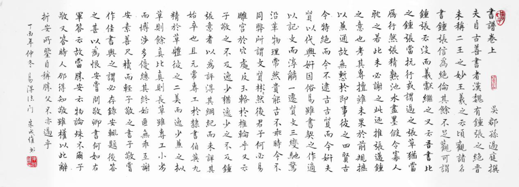 走进朱成维的书法艺术世界,依稀可以探寻到他从唐楷入手,喜欢楷书的端庄,尤以端庄又不失动感的行楷最为上心。从学褚遂良开始,深研颜真卿,归于柳公权,对柳公权的书法艺术几近痴迷,朱成维认为:柳公权的书法技法全面,入手难,但若从难入手,出来时,相对就容易很多。