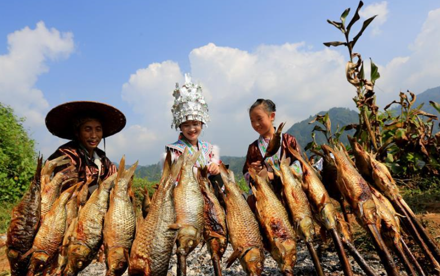 9月15日,在广西融水苗族自治县杆洞乡花孖苗寨,村民在烧鱼。 9月15日,广西柳州市融水苗族自治县杆洞乡花孖苗寨举行2018金秋烧鱼季活动,村民和游客共同开展水田拔河比赛、田间捉鱼比赛和烧鱼等活动庆丰收。