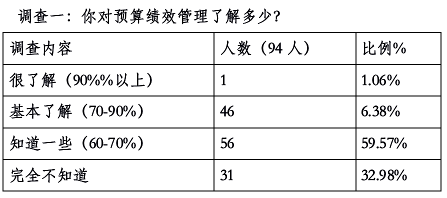 1、预算部门财务人员对预算绩效管理工作了解的程度较低。以调查一为例,“知道一些”和“完全不知道”的占比高达92.55%。