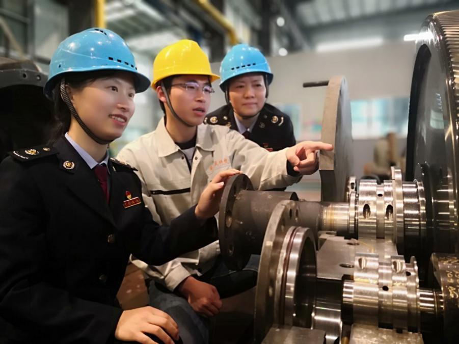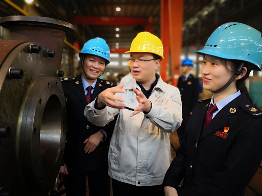 近期,江苏省南通市税务系统党员志愿者集中开展以“牵手民企、助力发展“为主题系列活动,通过深入民企大走访大调研,精准把握涉税需求,精准施策优化服务,为助推民企发展注入“税务力量”。图为11月29日,党员志愿者在民企车间了解转型升级阶段相关情况。(孙军 徐文逸摄)