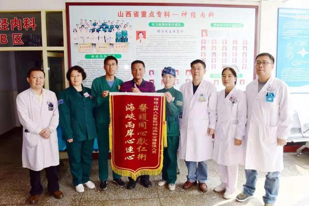 前不久,山西省稷山县人民医院神经内科收到一面来自祖国宝岛台湾的感谢锦旗,上面写着“海峡两岸心连心,医护同心献仁术”十四个金色大字,表达了台湾同胞黄樟正及其家人的感激之情。