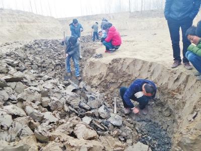 记者随后赶到小河寨村,在小河寨村委会对面的空地上,找到一个占地约15亩,深八九米的大土坑,坑壁上能明显看到一层一层的土层。坑内有四五个村民正在用铁锹“翻地”,把坑底表层的黄土层翻到旁边,露出底部的黑泥,然后用小铲子在黑泥里扒寻,旁边还站着十几个围观的村民。记者看到,有一片地面已经被“翻过”。