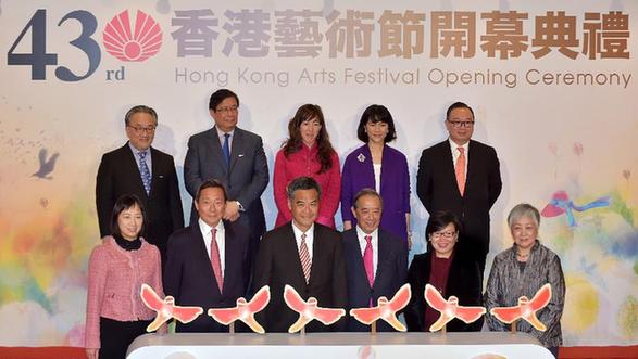 2月27日,香港特区行政长官梁振英(前左三)等嘉宾在开幕典礼上。当日,德国德累斯顿国家管弦乐团在香港文化中心演出,为第43届香港艺术节拉开帷幕。