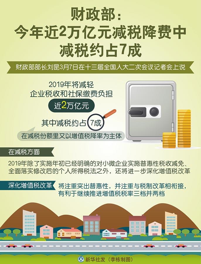 新华社北京3月7日电(记者申铖、刘红霞)财政部部长刘昆7日在十三届全国人大二次会议记者会上说,今年将减轻企业税收和社保缴费负担近2万亿元,其中减税约占7成,在减税份额里又以增值税降率为主体。