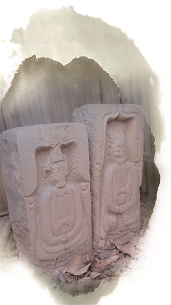 扬子晚报记者注意到,这两尊石刻是基于一块规整的方石雕刻的,高度在50厘米左右,宽度约为25厘米,其中一尊较高。人物以浮雕的形式呈现在方石的一面,他们盘坐着,身着宽袍大袖,双手合拢放置于腹前。方石上端的轮廓光滑、圆润,但人物面部已经破损不清。这对石刻看似不起眼,但在周围居民中却小有名气。栖霞区文化旅游局文物科负责人告诉记者,石刻原先收藏于山上居民家中,被当做“土地公”、“土地婆”供奉。后来居民搬迁,石刻就留在了山上。