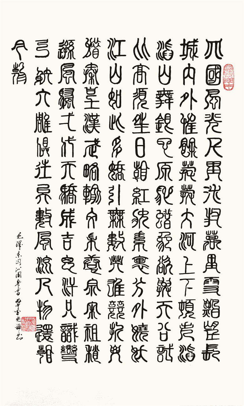柳尧福以楷书、行草书筑基,取法乎上,旁参当代名家,深研篆隶,他笔下的隶书《融通四海》一幅,以四平八稳的楷书做为骨架,取隶书“藏头燕尾、一波三折”的笔意,作品在法度森严、结构严谨的结构中,巧妙地融进圆润、俊秀、挺拔、整齐的笔意,使其充满清秀俊朗、雍容典雅的美感。在柳尧福的篆书《北国风光》中,他吸收了《虢季子白盘》《大盂鼎》等大篆的圆转流畅和雄浑朴茂,同时,他也取法《泰山石刻》、《峄山碑》等小篆的浑厚挺健和古拙虚灵,从而使柳尧福的篆书力度劲健挺坚、均匀协调,充分说明了柳尧福深入传统书法的功力,也彰显了柳尧福笔墨笔法游刃有余的掌控能力。