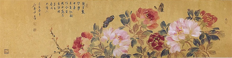 北香子根植在博大精深的传统艺术之中,把深厚的笔墨功夫与新时代的艺术语言熔铸于思辨的艺术思考,形成的艺术面貌如一泓清泉,让人耳目一新。观北香子笔下的《锦绣牡丹图》、《富贵吉祥图》两幅,创作中,北香子并没选择雍容艳丽一路,而是另辟蹊径,用自己擅长的艺术符号传递属于自己的艺术气息,显得独具匠心,她通过精巧的布局,让丰富多彩的自然之景与心灵深处的意象之境浑然一体,画面给观众带来清新秀丽,灵动活泼之感,画中枝叶摇曳生姿,形似神俏,动感强烈,富于节奏,画法上工写结合,枯湿互用,虚实相生,工能精准刻画出牡丹的花枝、花卉的具体形态,写能通过清彩淡墨渲染神秘幽䆳画面的背景,把具象置于恍惚浑沦之中。从“眼中牡丹”到“胸中牡丹”再到“笔底牡丹”,北香子把“外师造化,中得心源”的艺术创作,凝聚于丰富的笔情墨韵,从而构筑一种朦胧的、唯美的境界,使画面充满诗意。再看《叶上清霜、红藕知意图》、《花月两相倾》两幅,描绘“出淤泥而不染,濯清涟而不妖”、亭亭净植的荷花,在诗词的点缀下,“荷花的丰姿与气韵引人遐思,如谦谦君子,临风摇曳,遗世而独立”,仿若“清香阵阵,扑面而来,沁人心脾”。