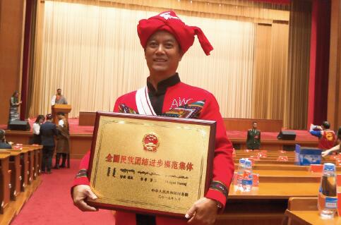▲岩克姆领取“全国民族团结进步模范集体奖”。