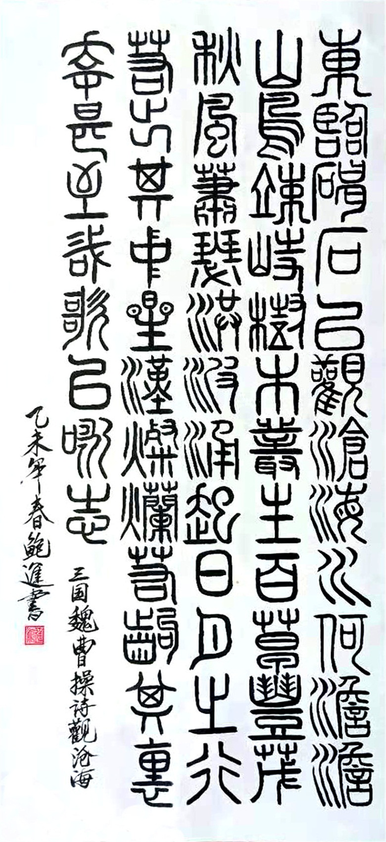 纵观鲍进的隶书扑面而来的气息使人流连,让人感动,他那宽博厚重的书写形式,章法规整严谨、朴茂雄浑,笔墨大气磅礴、酣畅淋漓,线条遒劲洗练,含蓄蕴藉,比如他创作的《曹操观沧海》、《道法自然》等,刚柔相济、方圆结合,极富创造和革新精神,具有强烈的视觉冲击力,字里行间洋溢着技法与审美的和谐统一,激荡着书法家鲍进思辨的处世哲学、纯净的艺术真谛和点滴的生活感悟,三者高度结晶,互生奇妙,驻足鲍进的篆书之前,犹如面对数年交往的老友,正娓娓诉说鲍进对书法艺术另辟蹊径的理解和鲜明独到的观点,使笔者体悟许多真知,并深受其惠。