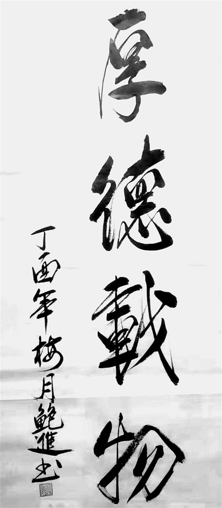 再看鲍进气势飞动的行草书,《厚德载物》、《海纳百川》等等,结体劲韧扎实,隽逸柔畅,笔画笔意极具“二王”韵致,线条起承转折中,含蓄多变,遒劲隽美,点画交相辉映,融成精妙,如千里阵云、势如破竹,章法布局既保持侧欹,又彰显和谐;既变化丰富,又个性鲜明,正斜互使、静动互藏,洒脱而严守法度、飘逸而不失真功、险峻而恪守端庄,从中可以看到鲍进的书法,处处有真功,笔笔显古法,于盈尺之间,书写天地之阔,充分体现鲍进耐住寂寞,追求书法艺术真谛为本,修出真功的书法精神。