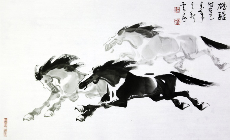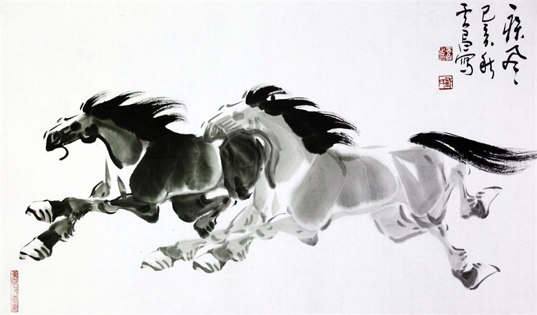 马的形象本身就有着浓郁的古典文化情结,历代以来不乏画马的名家高手。但刘云昌仍能在前人的基础上独辟捷径,不断探索出新的绘画技巧,从而创造出生动鲜活、超凡脱俗,深得自然天趣的马画艺术。他善于从马奔跑的角度入手,深入到笔墨的内部,从而能在深入细致的笔墨线条中获得艺术的灵感。他笔下的马不以形耀人眼目,却以意动人心弦,有一种“万趣融其神思,万物为我所有”的感觉。画家通过开拓性的笔墨探索以及传统水墨情趣的改造,逐渐形成了一种独具个性的画风。在他笔下,奔跑在画卷上的骏马是生命本真的回归,雄浑的笔墨则来源于厚重的传统,承载着中国五千年的文化和历史。