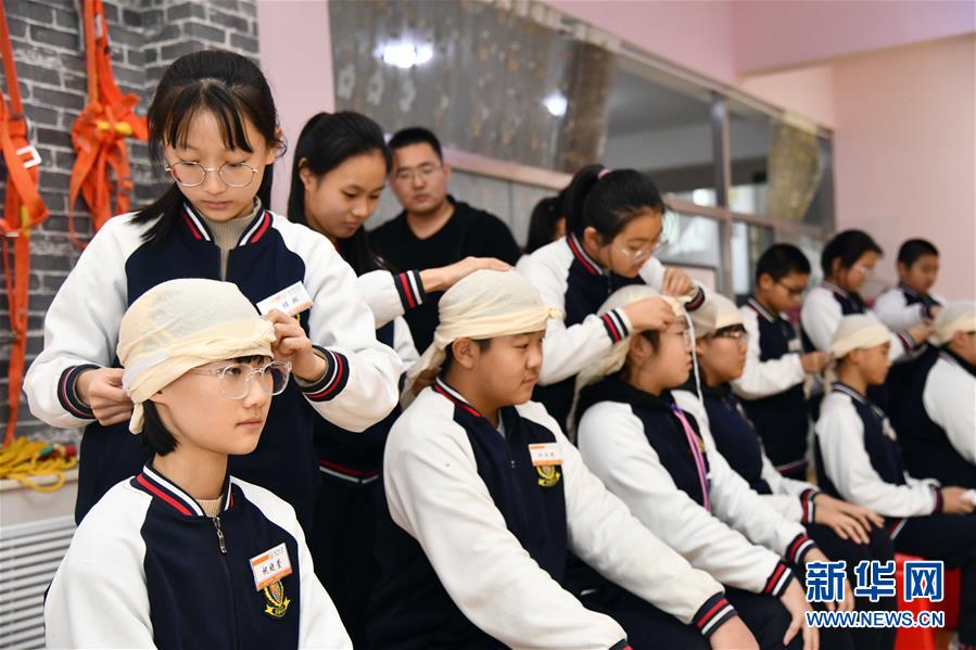 12月11日,在威海市新都中学,怡心红十字社团的同学们在练习伤口包扎技能。
