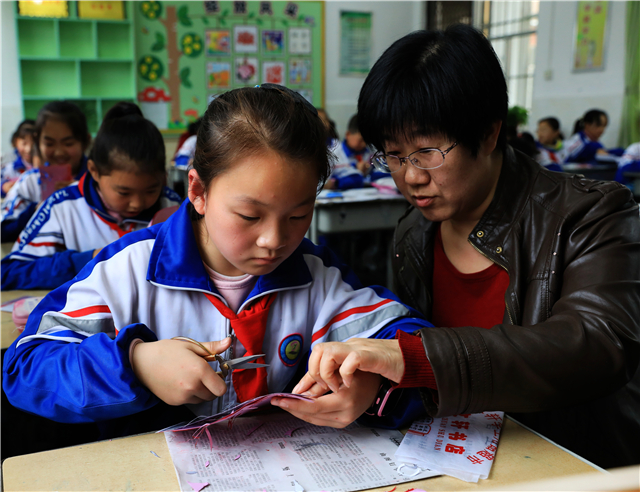 ▲2019年10月23日,镇原县东街小学,惠富君手把手教该校“小巧手剪纸社团”的孩子们剪纸。