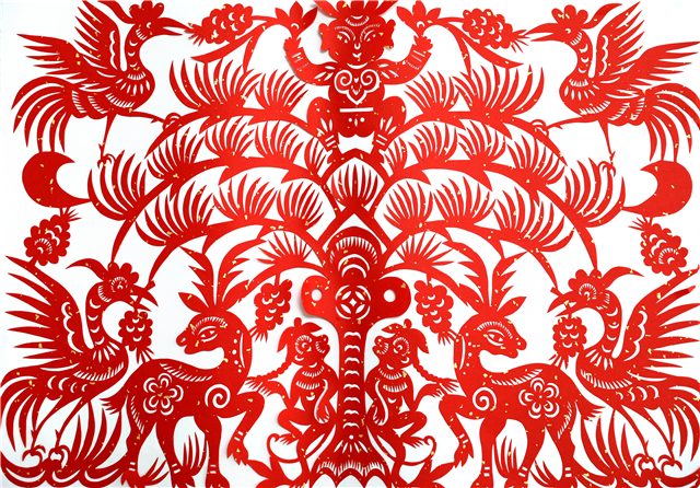 ▲作品《生命树》,在南京博物院举办的国际民间剪纸艺术节上获金奖。