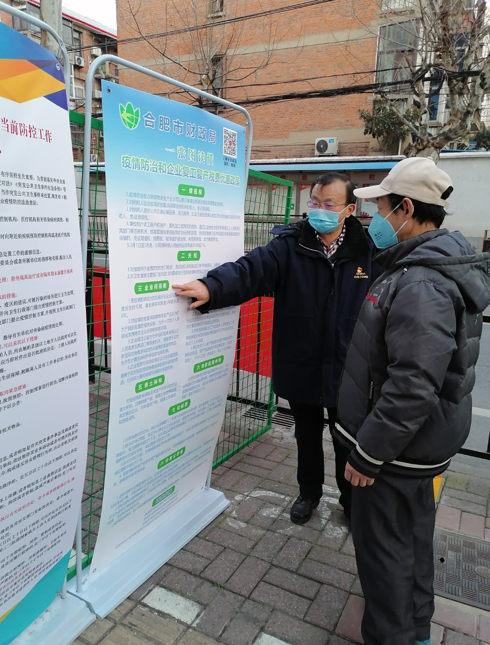 图为章佳斌向群众宣传企业复工复产税费优惠政策。