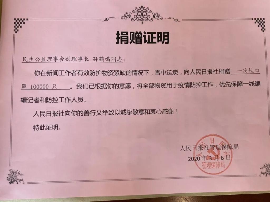 3月17日,人民日报社《民生周刊》公益理事会副理事长孙鹤鸣向人民日报社捐赠了10万支一次性医用口罩。