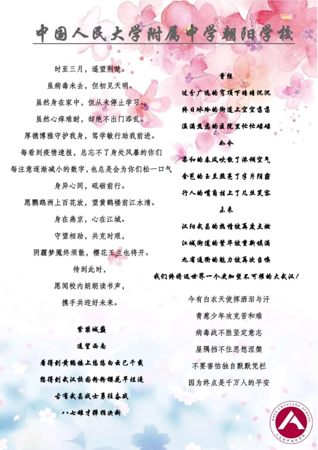 据悉,人大附中朝阳学校全体师生时刻关注疫情,心系武汉,欲为武汉同胞送去最真切的祝福。纸短情长,见字如面,他们以诗、信为笺,将美好祝福送给华中师范大学第一附属中学全体师生,也传递给湖北武汉全体老师与学子。
