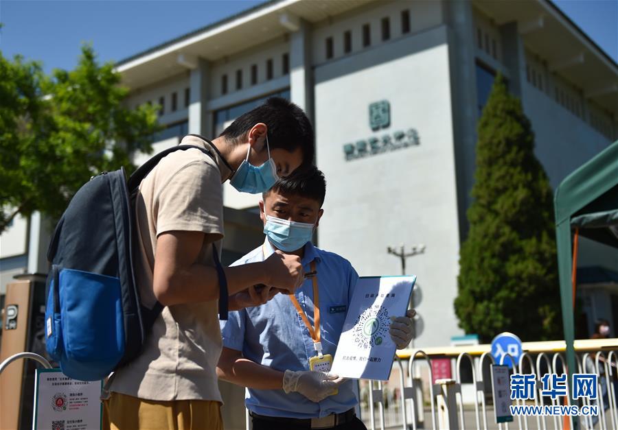 5月12日,在中国国家图书馆入口处,工作人员引导读者扫描健康码。 当日,中国国家图书馆有序恢复开馆,开放区域为国家图书馆总馆南区,实行预约限流入馆。 新华社发(陈钟昊 摄)