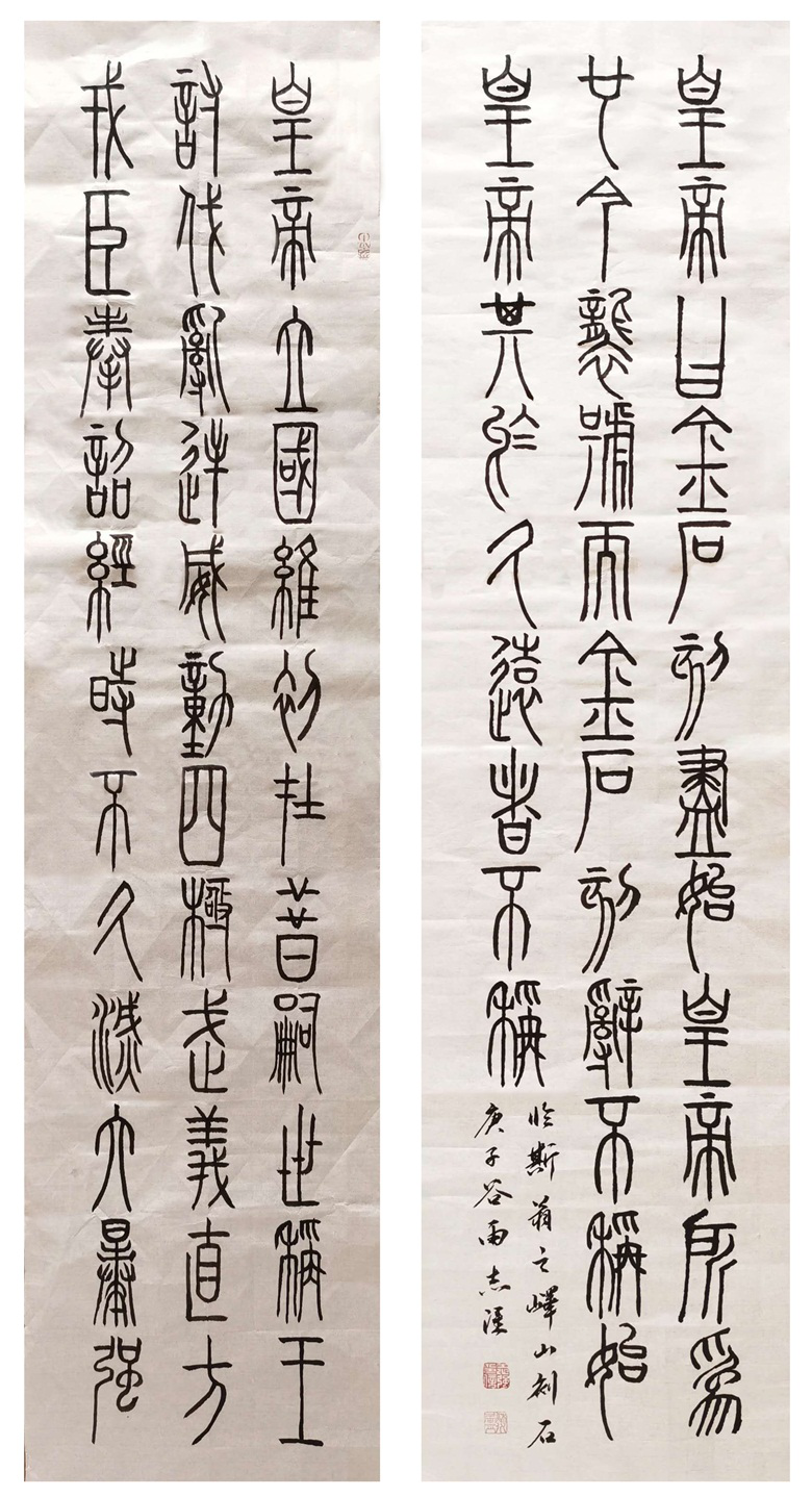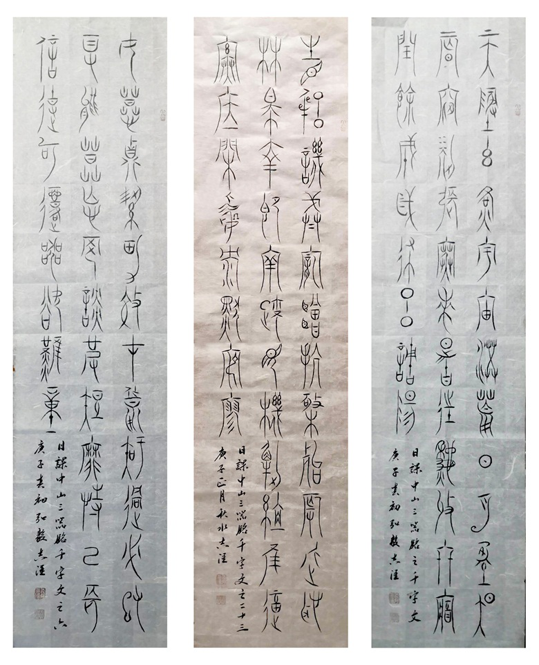 观尼志强的行书《司空图诗品》系列,结体自然,用笔流畅,韵致和谐,勾、带、丝、连,刚柔相济、张弛有度,欤侧转使,亦柔亦刚,方圆结合,对立中彰显典雅之美,洒脱中坚守严谨之法,险峻中又凸显深厚之功,有“王氏”的韵质、“宋四家”的飘逸,亦有 “赵氏”的圆润,集诸家之长,统合一体,融成精妙。再看《中山三器铭千字文》系列、《临李斯峄山碑》等篆书作品,圆实劲健的用笔,内敛含蓄中充满丰富的变化,线与线、点与面的交融生辉,似若贯注源源不绝的动力,力可扛鼎的线条构筑连绵贯通的气势,绚丽多姿的结体营造一种雄浑朴茂、磅礴厚重的视觉美感,可谓是:“妙在能合,神在能离,离合之间,神妙出焉”,充分诠释出意蕴、格调的高度统一,在古典书法与时代审美之间建立桥梁和纽带,实现自由畅快地互通。纵观尼志强的书法,不管是行草、行楷,还是篆隶,都不愠不燥,不急不促,不染半点俗尘,不带有任何杂念,干干净净、爽爽朗朗,清风朗月的韵律演绎着读书人的虚静,生动宛然的节奏洋溢着意境悠远的诗心,让观者在享受视觉审美之时,感慨尼志强诗文迸发的才情,也仿佛感受到一个新时代读书人坚忍不拔的意志、辛勤卓绝的苦练。