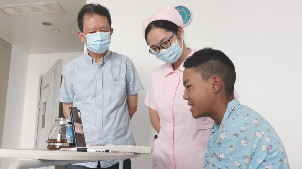 8月7日上午10点,在东南大学附属中大医院整形外科病房,一堂特别的“云课堂”准时开讲。现场授课的“小老师”张宸来自东南大学医学院,她通过精美的PPT,教藏族男孩东周才仁学汉语。当天,南京热心好市民吴苏华也赶到病房,和张宸、医护人员共同参与线上汉语辅导。