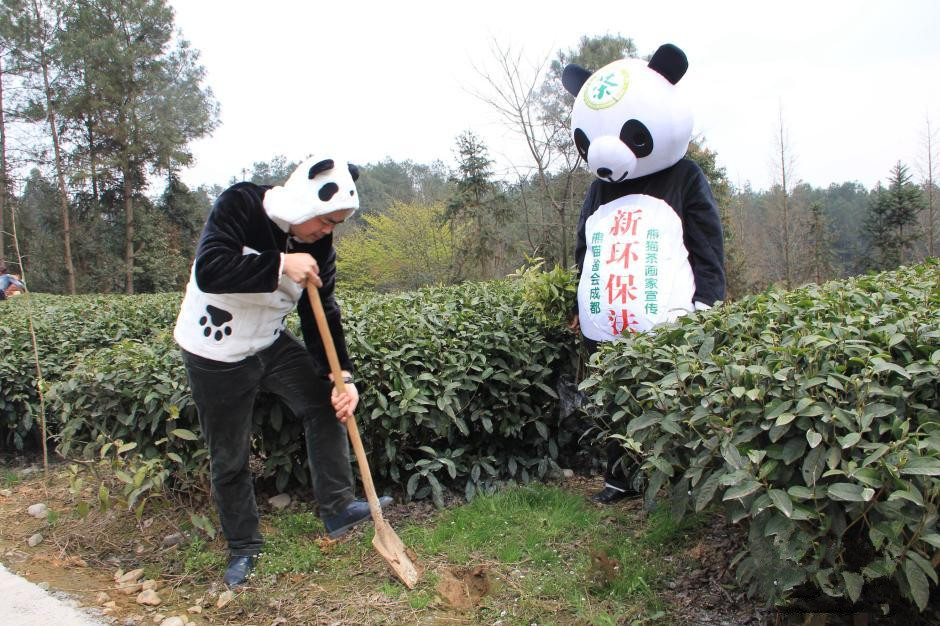 3月12日植树节,环保汉字熊猫书画家安琰石组织熊猫茶环保奖活动参与的环保志愿者,穿扮成大熊猫模样,在世界茶源、熊猫故乡雅安熊猫茶生态茶山植树,并倡议环保理念。图为志愿者在植树现场