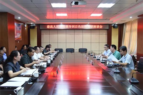 7月16日至17日,最高人民法院审判委员会委员、中国应用法学研究所所长姜启波,最高人民法院《中国应用法学》编辑部主任韩德强到百色调研指导人民法庭建设、司法改革以及家事审判等工作。广西壮族自治区高级人民法院立案庭庭长文东,百色中院党组副书记、常务副院长蒋旭初和党组成员、副院长罗永勇陪同调研。