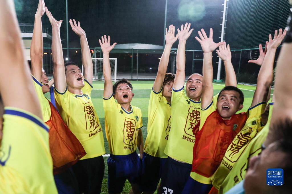这是海南海龙足球队队员在比赛前一起加油(9月13日摄)。