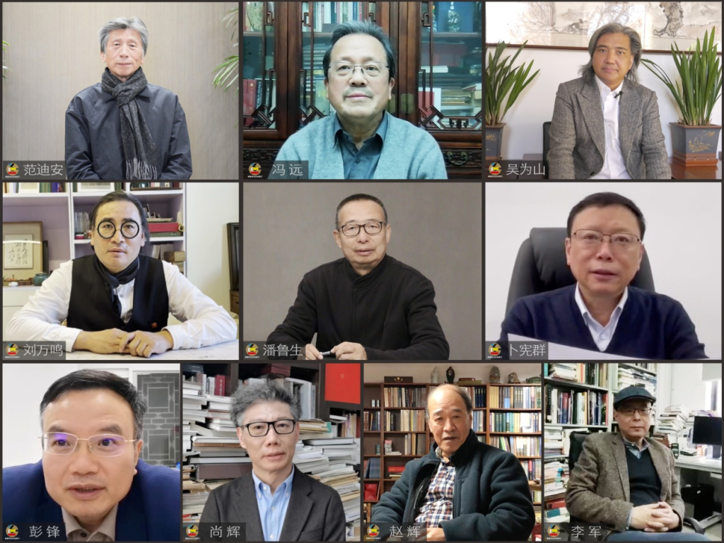 “视频空间”的领导嘉宾有:中国文联副主席、中央文史馆副馆长、中国美术家协会名誉主席冯远,中国美术家协会主席、中央美术学院院长范迪安,全国政协常委、中国美术馆馆长、中国美术家协会副主席吴为山,中国文联副主席、中国民间文艺家协会主席潘鲁生,中国国家博物馆副馆长刘万鸣,中国社会科学院中国历史研究院古代史研究所所长卜宪群,《美术》杂志社社长兼主编、中国美术家协会理论委员会主任尚辉,北京大学艺术学院院长彭锋,北京大学文博学院原院长赵辉,中央美术学院人文学院院长李军。出席开幕式的专家学者有:西安美术学院教授彭德,中国美术学院色彩研究所所长宋建明,敦煌研究院研究员王进玉,北京服装学院教授赵云川,中国人民大学艺术学院教授王文娟等专家学者,以视频截图的方式完成了开幕式合影。开幕式由中国艺术研究院美术研究所副研究员孔德平主持。
