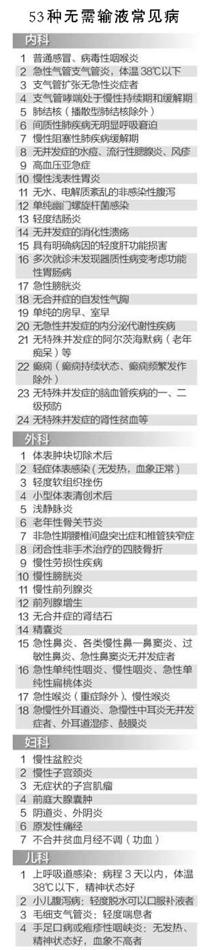 8月18日,安徽省卫生计生委发出通知,确定了门、急诊包括内科、外科、妇科及儿科共计53类不需要输液治疗的常见多发病,包括普通感冒、上呼道感染、小儿腹泻等。并明确只有在患者出现吞咽困难、严重吸收障碍(如呕吐、严重腹泻等),以及出现病情危重,发展迅速,药物在组织中宜达到高浓度才能紧急处理这三种情况下才使用静脉输液。医疗机构每月随机抽查处方进行点评,安徽省卫生计生委将于发文三个月后组织对省直医疗机构检查并对各地医疗机构进行抽查,检查结果将对全省进行通报并纳入对各地的目标考核。