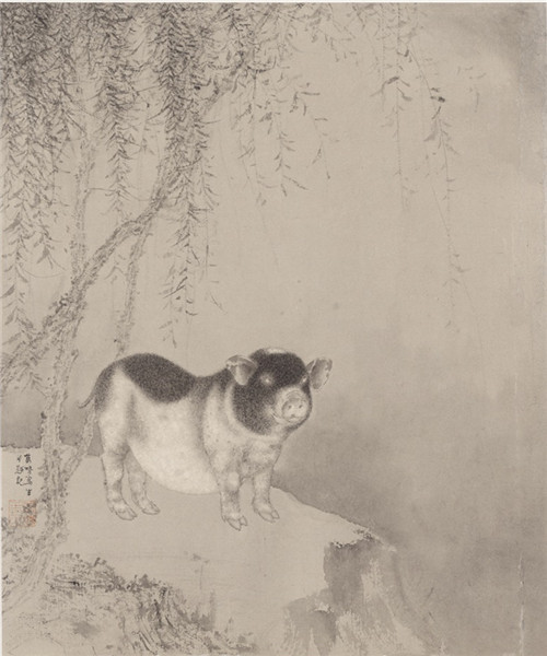 万鸣画花鸟、走兽、人物,尤喜画猪,我看到他画了几十幅猪图。万鸣画猪,一是把古人不画猪这个空白充实起来,二是他不忘本根。他生于农村,少时见到猪是常事,农家没有不养猪的,他对猪有特殊的感情。他画的猪也不同于齐白石、徐悲鸿等。他也是用元法化宋之法加之他自己的短戳笔法而画成,万鸣画的猪,不但画出猪之形状,猪之精神,更画出各种猪的特色和性情。这不仅是他的功力所致,也是他爱猪的精神所致。时人有曰:“齐白石的虾,徐悲鸿的马,黄胄的驴,李可染的牛,刘万鸣的猪。”所言据实而合情理也!