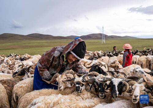 7月12日,在西藏那曲市双湖县多玛乡,牧民准备挤绵羊奶。