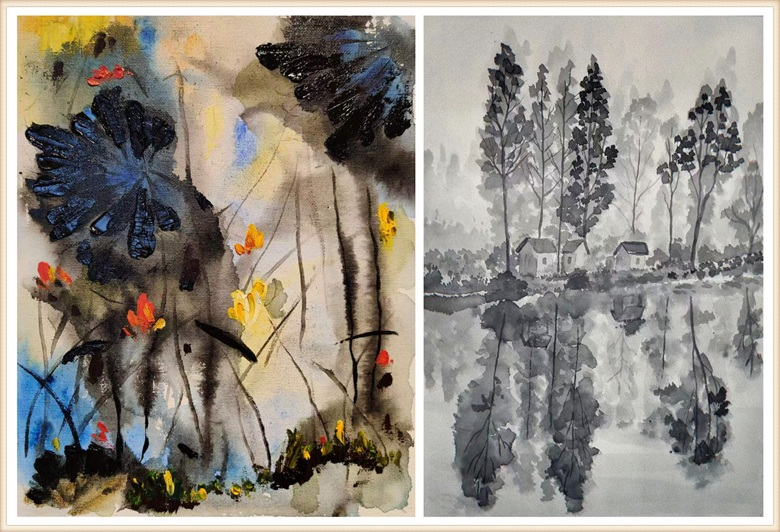 《夏荷》(多种材料) 《清晨》(水墨画)