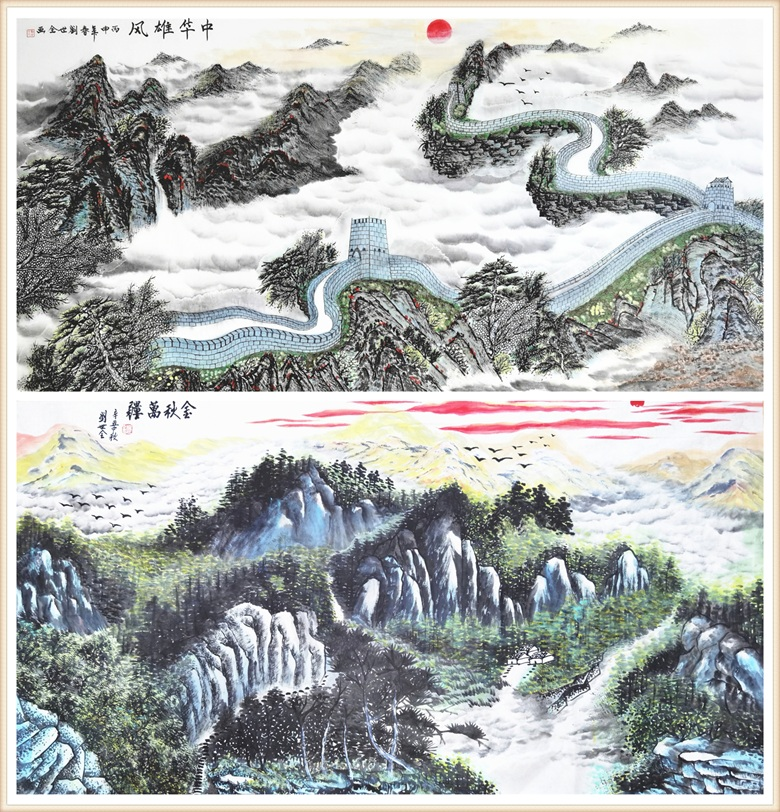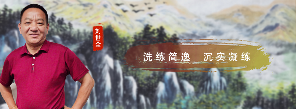 观其画作,从构图上洗练简逸,笔运沉实凝练,传达出山川之美和新奇之姿;笔法则尖峭简洁,意境伟峻秀逸,反映了他的自身风貌;笔墨苍劲整洁,更富有秀逸之气。将细腻融于宏大之中,彰显着刚柔相济,虚实相生的中国画精神。有一种大开大合的雄浑气势,泼洒中的旷远,皴染间之细谨,如泰山之凝重,似大海般深沉。山川与秀水同呼吸的谐美意趣,充满了空灵、透净、鲜亮、爽利的奇特韵致;苍穹广袤的郁郁葱葱彰显着深邃旷达之幽远;大笔触,大胸怀的挥洒又流淌出激越酣畅的纵横淋漓。常云“字如其人,画如其人”,即是说书画之作是作者心灵之折射,画家的性情、爱好、脾气、品位皆能体现于中。刘世全的作品,无不渗透着大气、奔放、开阔、高远的大美关怀,将情感对景致作了融为一体的贯穿。