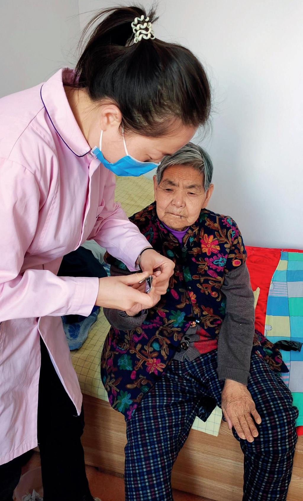 ▲王楠为护理中心老人剪指甲。