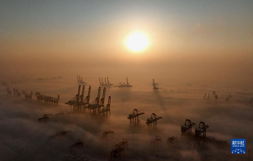 平流雾中的唐山港京唐港区景色(1月5日摄,无人机照片)。
