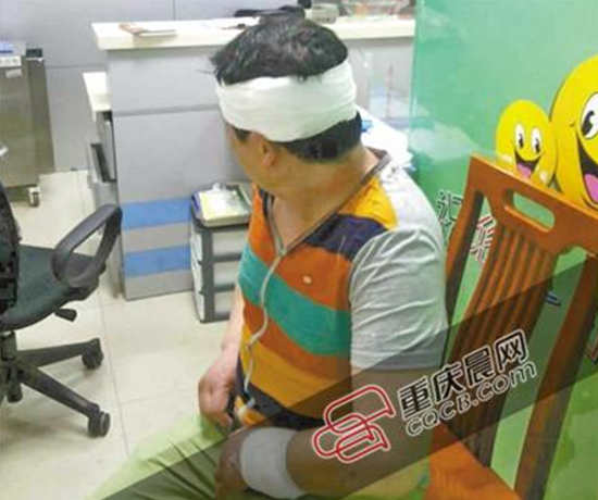 昨天下午,被打的男游客在附近的武警医院接受检查和治疗,头上缠着绷带,左手腕和手掌处都有血迹。