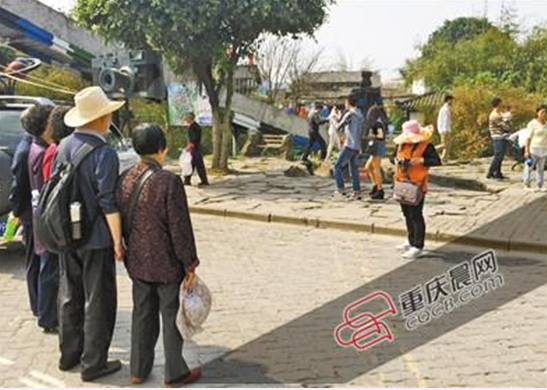 在事发地附近,重庆晨报记者看到不少穿着黄色马甲的拍照者,她们拿着一本相册,背着一个单反相机,坐在路旁凳子上,见到游客就会上前推销拍照服务。记者咨询了一下价格,拍一张照片10块钱,可在5至10分钟内取。