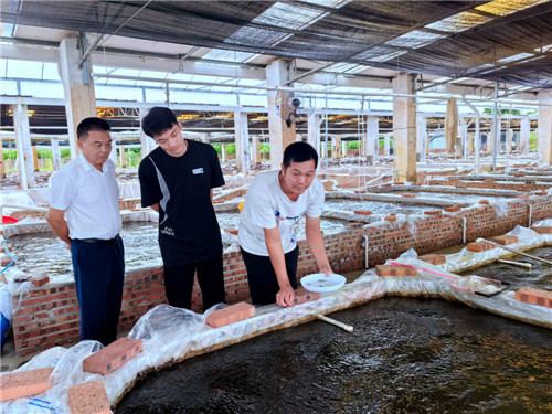 产业园技术专家现场指导养殖户关伟洛鱼苗养殖。黎剑摄