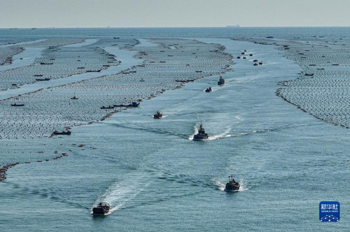 金秋时节,在山东省荣成市,各大海洋牧场海上养殖区一派繁忙景象,渔民驾驶渔船、舢板出海作业,在碧海上“绘”出一幅幅秋日渔耕图。
