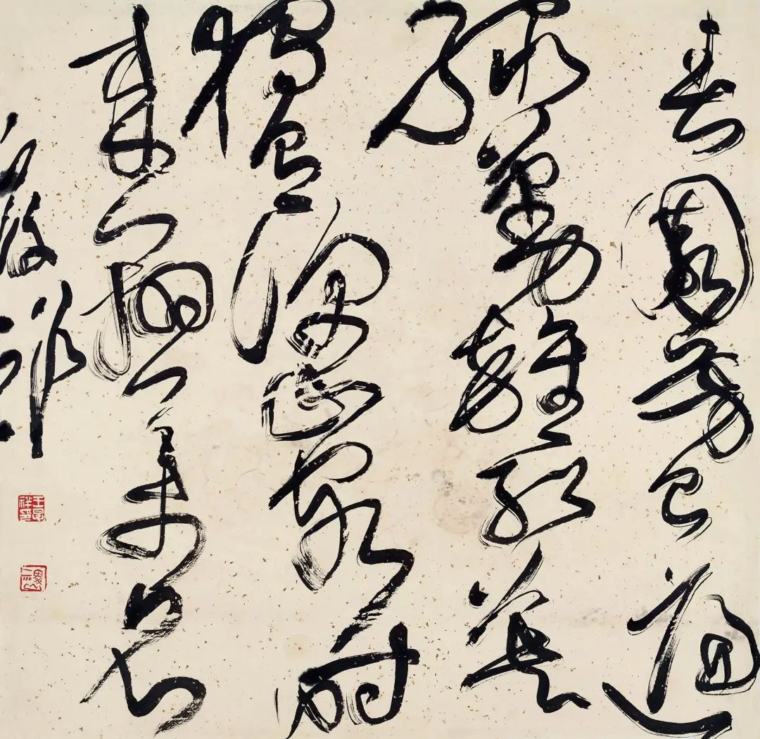 另一件狂草书作唐人常建《题破山寺禅院》,写得也是异常精彩。跨度大,粗细浓淡、线条块面都在自然的韵律中显得腾挪有致、激荡起复,尤其是“禅房花木深”五字的侧锋虚笔,与起笔的浓烈和后面的黑墨形成了对比的空间,显得整个作品张弛错落、流水环绕、动静相和,浓浓禅意隐隐透来。这一件作品原作比起印刷品更为精彩,尤其是原作中墨色浓淡的起伏变化,在印出的作品集中体现不出来。