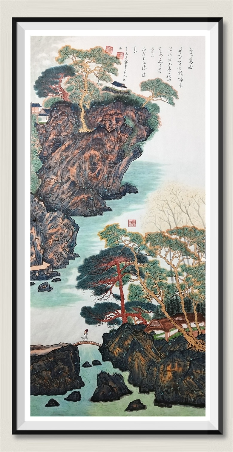 黄志法是一位很聪明的画家,他善于吸收古人之法,但是,他绝不固守一家、一派,更不固守一体、一貌,而是,在古人之法之进行提炼、概括,为己服务。从黄志法的作品里可以清晰看到他融汇了前人之法,却很难发现他取了哪家之法,他融了前人之意,却不露痕迹,更不露声色地表现于自己的艺术之中,即便从他的作品里看到了荆、关、董、巨,看到了“吴门画派”,看到了王希孟,看到了吴湖帆、张大千、何海霞、贺天健等名家的影子,那也是融他人之法为我法,融他人之意为我意,融了古法,而入了我意。变的是样式、是形式、是技法,不变的是笔墨、是色彩、是美的感受。显然,这是放眼历代名家并结合自己特点而形成的审美考量,也是“入古法、写己情、出己意”的艺术思辨,正因于此,黄志法的青绿山水才妙造了丹青,绘出了新意,给观者很强的视觉感染力。