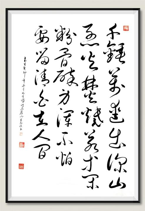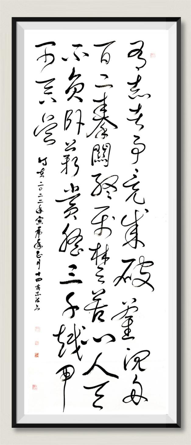 也正是对“书画本来同”有着似若无意,却很独特的理解,黄志法的书法也总能呈现出“书法如画”的妙境,尤其是他的行草书,入笔、行笔、收笔,起伏于锋杪,殊衄于毫芒,字里行间充盈着洒脱之风,又洋溢着画意诗情。线条的刚与柔、动与静、快与慢、欹与正,如印印泥、如屋漏痕、如锥画沙、如折钗股……点画,对立而和谐,潇洒显真功,共性之中,又凸显着鲜明的个性,如高山坠石、如陆断犀象、如百钧弩发、如霓虹饮涧……。笔法、墨法、线条、点画,有收放、有开合、有疏密,相得益彰,交相辉映,书法如画,画里有意,虽然书写者无意,鉴赏者却生了情。