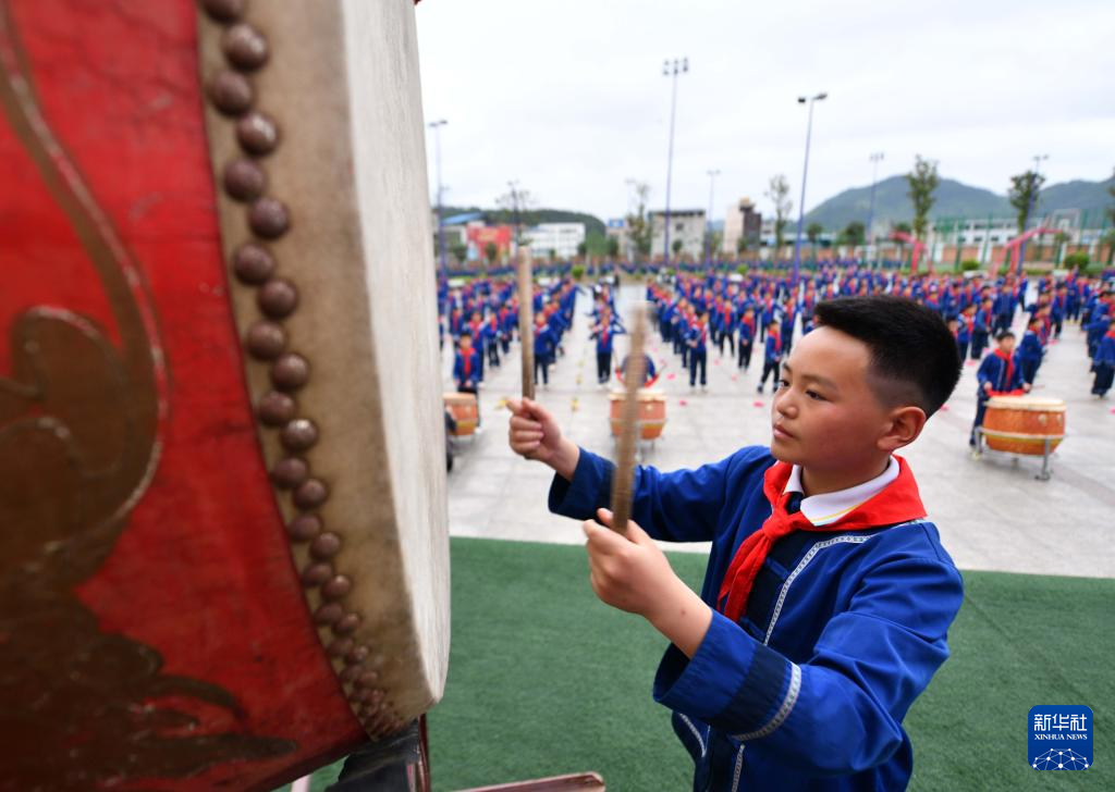 4月29日,学生在贵州省岑巩县羊桥土家族乡中心小学大课间活动上敲鼓。