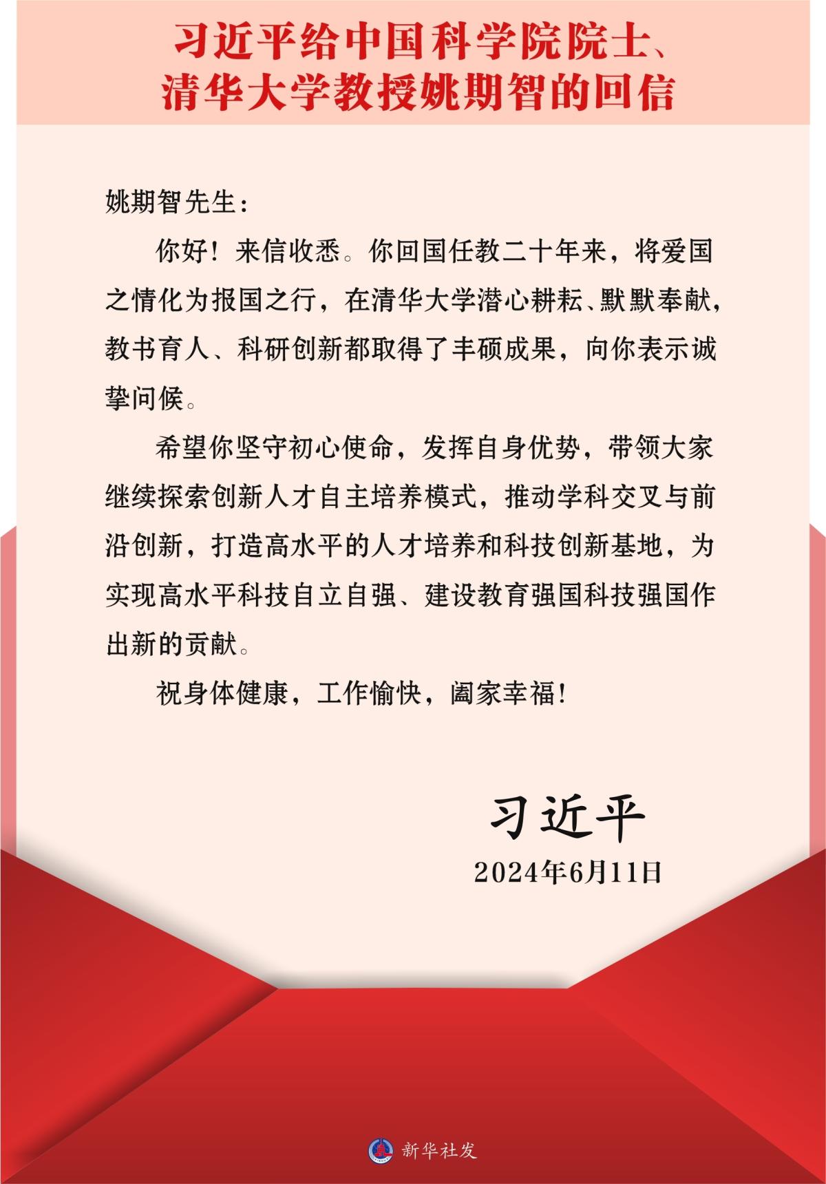 新华社北京6月12日电 近日,中共中央总书记、国家主席、中央军委主席习近平给中国科学院院士、清华大学教授姚期智回信,向他致以诚挚问候并提出殷切希望。