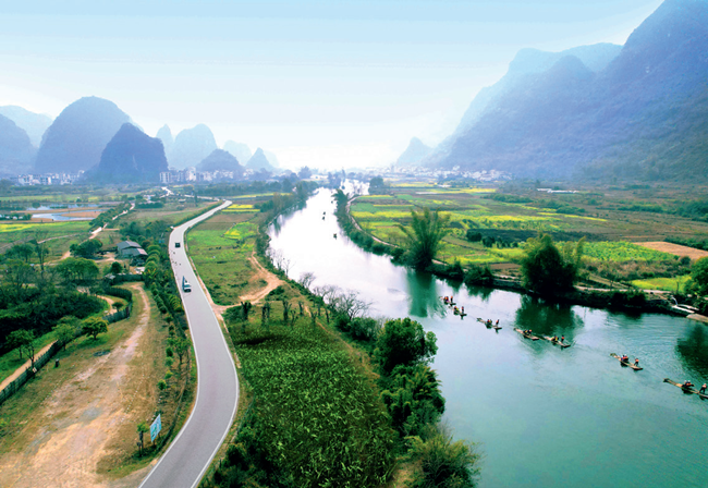 ▲广西桂林市阳朔县遇龙河旅游公路沿线秀峰奇特,风景旖旎。